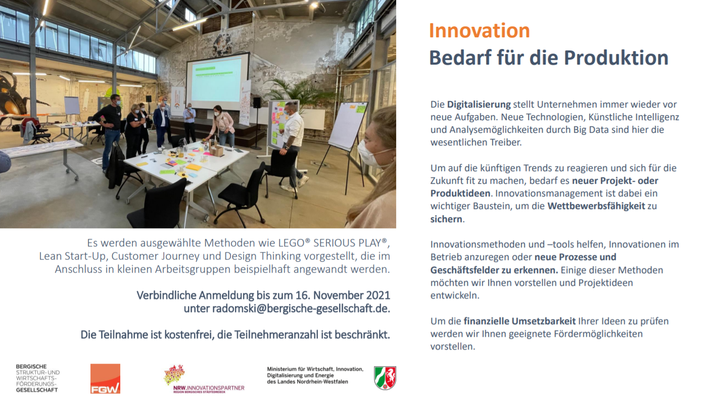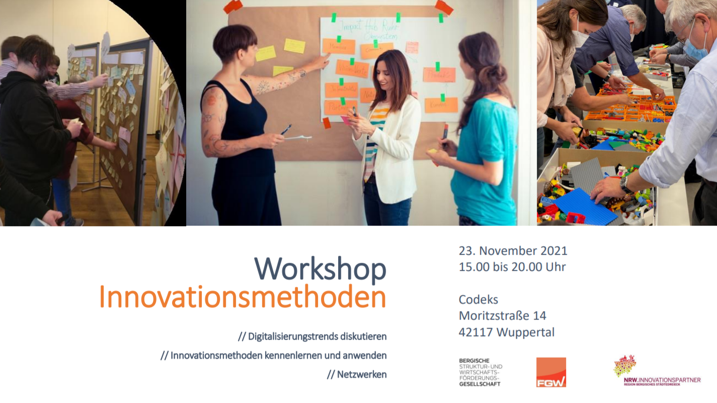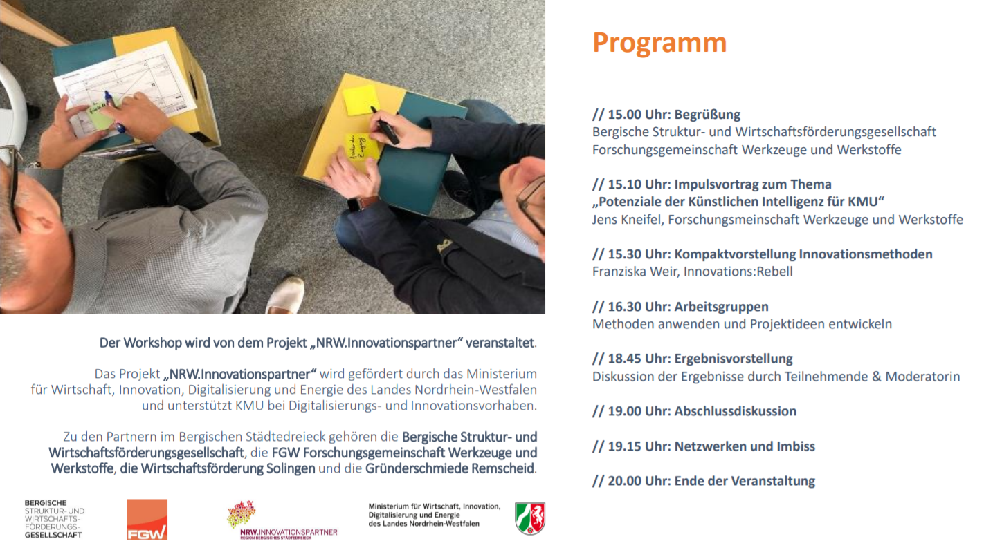 Diese Fragen sollen in einem Innovationsworkshop beantwortet werden, der im Rahmen des Projekts NRW.Innovationspartner durchgeführt wird. Innovations-Coach Franziska Weir, Geschäftsführerin von Innovations:Rebell und Dozentin an der FH des Mittelstandes, hat jahrelang als Managerin und Unternehmensberaterin unter anderem bei Daimler, FC Schalke 04, E.ON und Porsche Consulting gearbeitet und bringt das entsprechende Praxisverständnis mit. Im Workshop wird sie ausgewählte Methoden wie LEGO® SERIOUS PLAY®, Lean Start-Up, Customer Journey Mapping und Design Thinking vorstellen, die im Anschluss in kleinen Arbeitsgruppen beispielhaft angewandt werden.