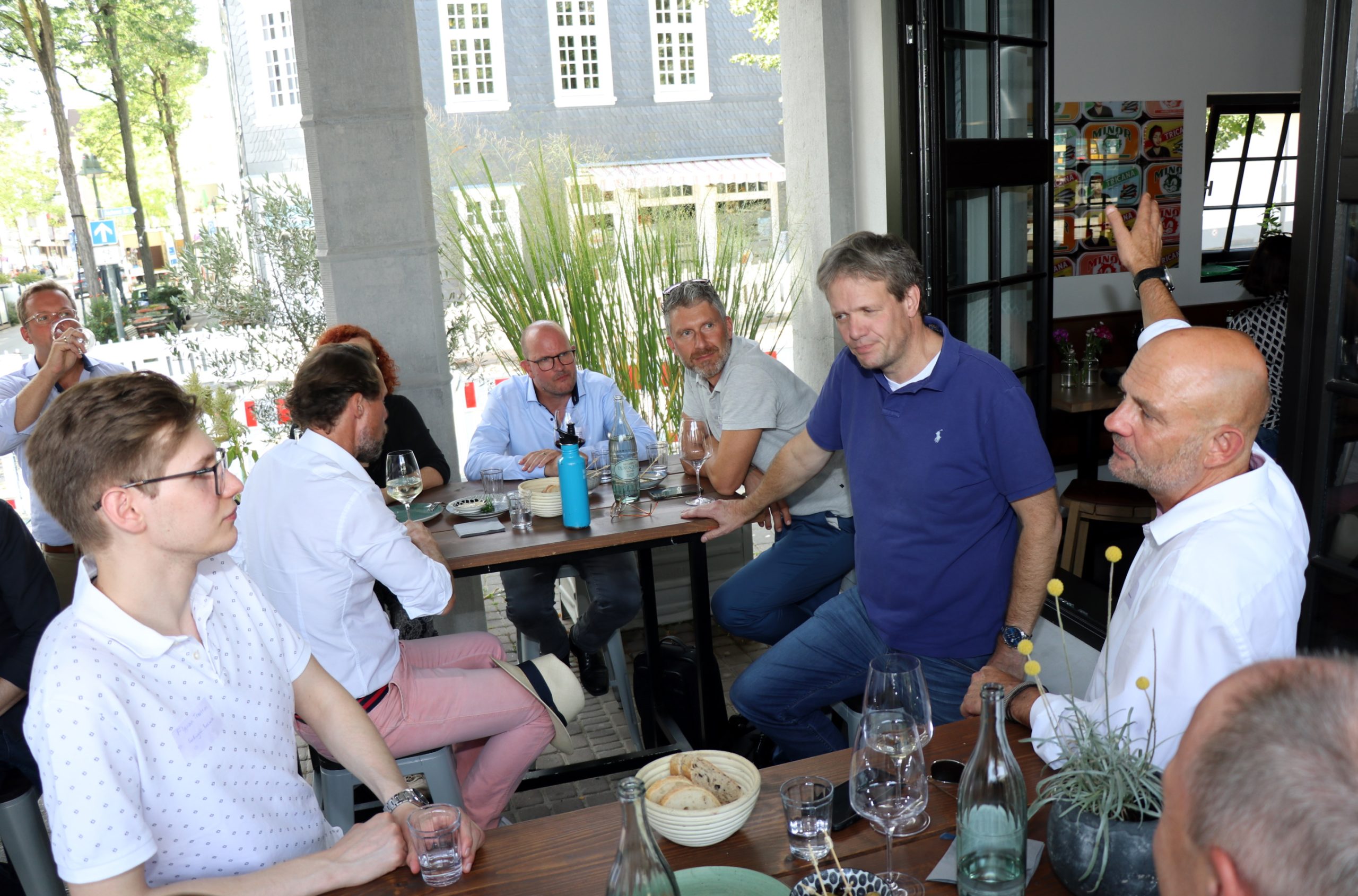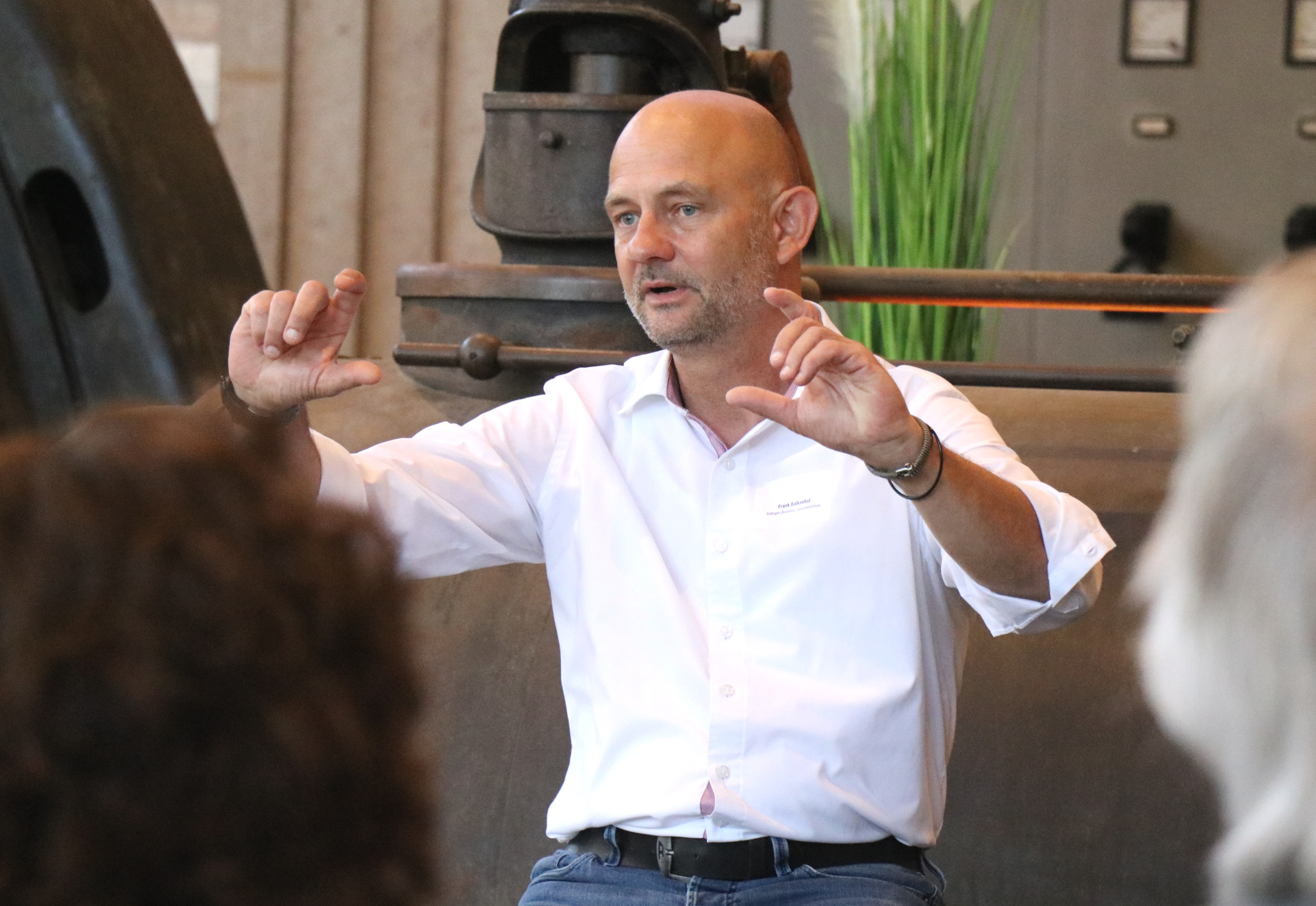 Bei 30 Grad Außentemperatur konnten die Tour-Teilnehmenden den Tag in der Alten Maschinenhalle ausklingen lassen und vertiefende Gespräche führen. Solingens Oberbürgermeister Tim Kurzbach ließ es sich nicht nehmen sich intensiv mit den Gästen auszutauschen: „Wir haben Interesse und Begeisterung geweckt, was hier in Solingen alles möglich ist. Unsere Gäste haben wahrgenommen, dass sich Solingen als wachsende Stadt in einer Aufbruchstrimmung befindet“.