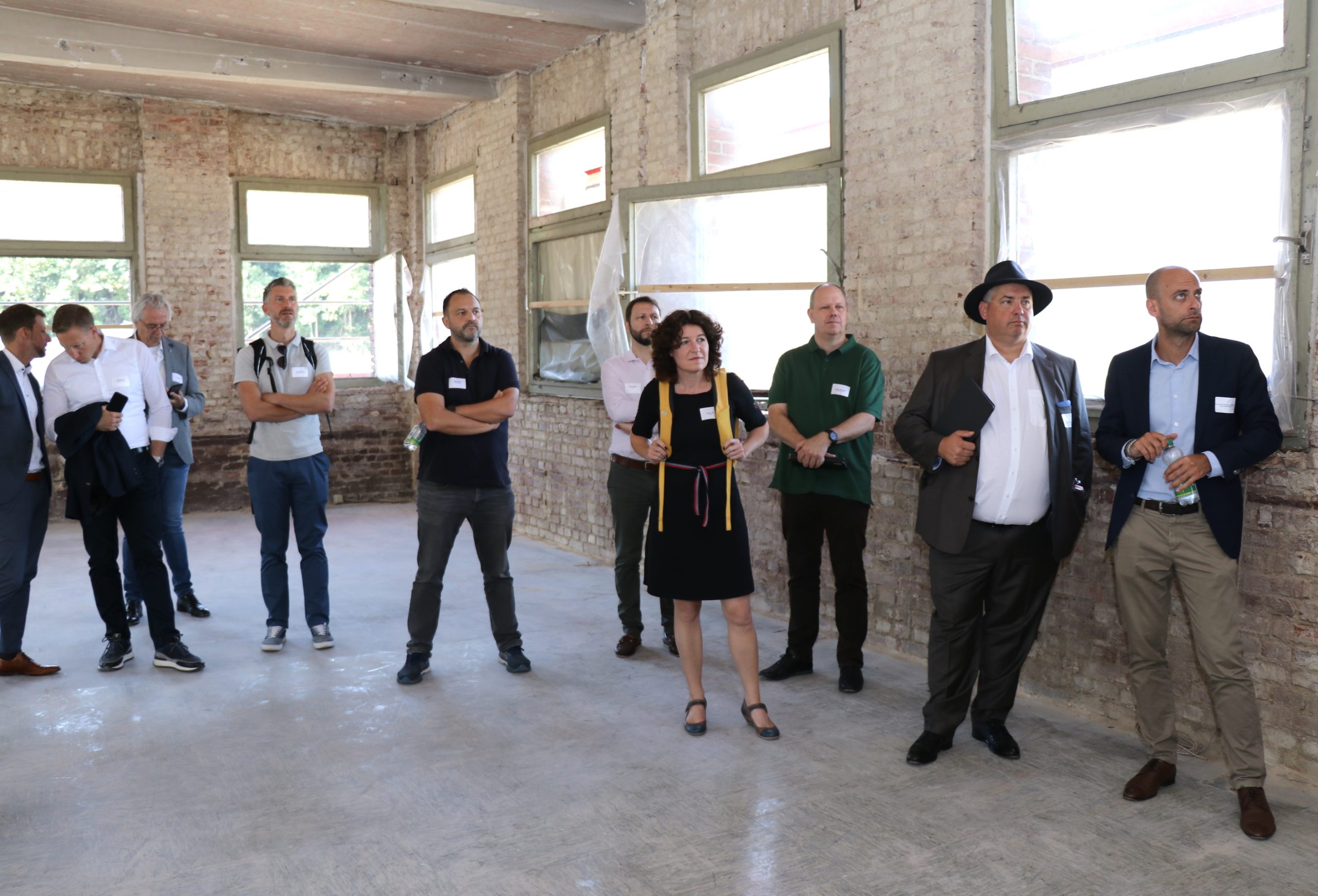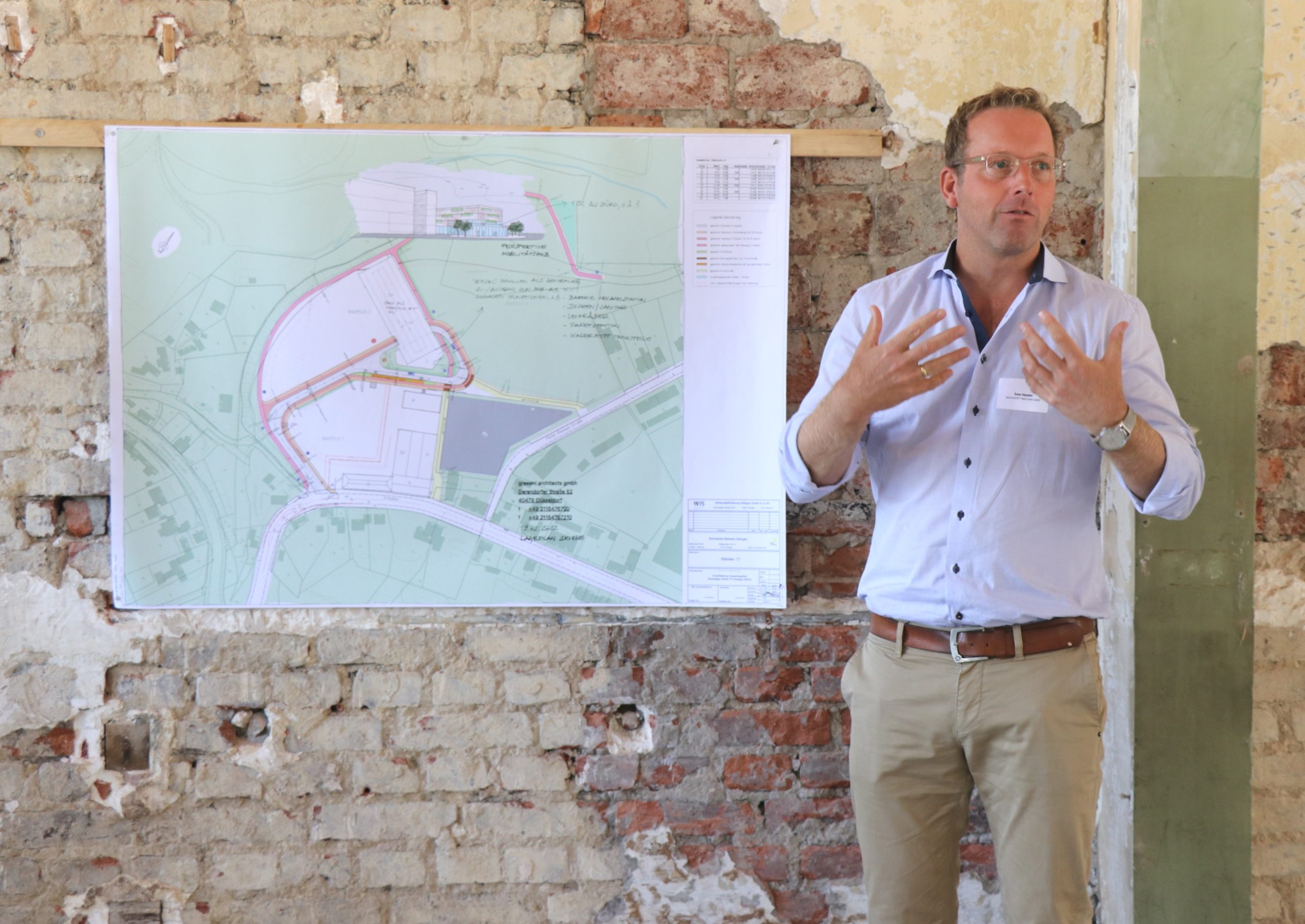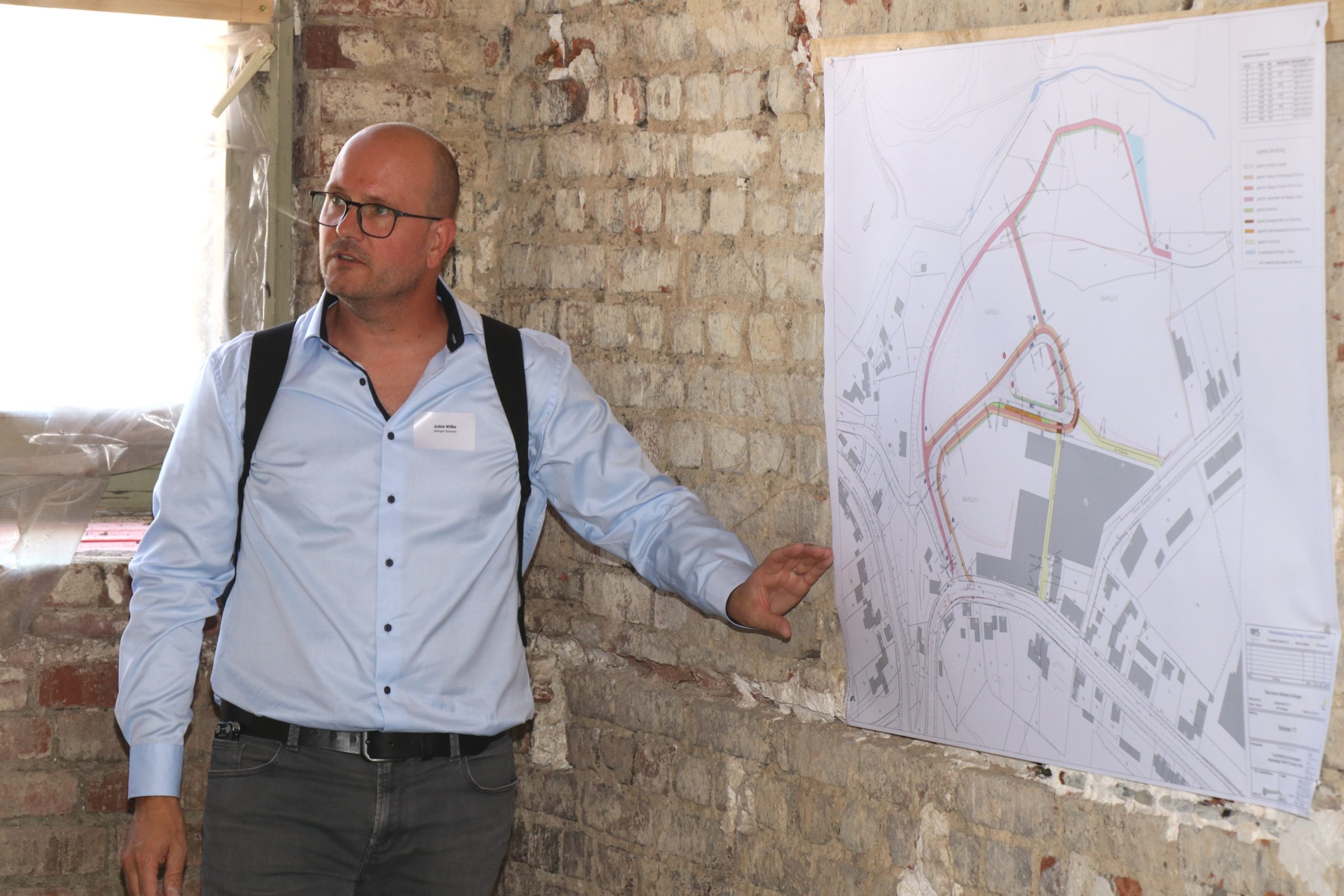 Zu Beginn der Tour stärkten sich die Gäste beim gemeinsamen Frühstück in der „Alten Maschinenhalle“ auf dem Gelände des Gründer- und Technologiezentrums. Frank Balkenhol und Andreas Budde, Baudezernent der Klingenstadt Solingen, eröffneten die 1. Solinger Investorentour und gaben einen ersten Einblick in die aktuellen Entwicklungen der Klingenstadt. Den Start machte Marc Böhnke von den „greeen! Architects“, in dem er potentielle städtebauliche Entwicklungen auf dem Gelände des Gründer- und Technologiezentrums vorstellte. Mit dem „BOB“ (Batteriebetriebene Oberleitungsbus) der Stadtwerke Solingen fuhr die Gruppe dann zum Rasspe-Gelände bei Stöcken 17. Auf dem ca. 60.000 qm großen Gelände wurde von Achim Willke, Prokurist der Wirtschaftsförderung Solingen, das enorme Entwicklungspotential des Gebietes vorgestellt. Stöcken 17 wird das bergische Gewerbegebiet der Zukunft, welches auf zwei Säulen basiert: Die Erschließung auf einem durchdachten Nachhaltigkeits- und Mobilitätskonzept sowie ein Ökosystem, welches die aktuellen Herausforderungen intelligenter Produktion sowie von nachhaltigem Handeln als Ansiedlungsschwerpunkte definiert. Sven Heyden, der für den Investor Bauconzept Real Estate GmbH für das erste große Bauprojekt – die Revitalisierung der teils unter Denkmalschutz stehenden Bestandsgebäuden – auf dem Rasspe-Areal verantwortlich zeichnet, erläuterte die anstehenden Sanierungs- und Umbauarbeiten und erklärte mit welchen Nutzungen sich das Projekt in das Gesamtkonzept Stöcken 17 integrieren wird.