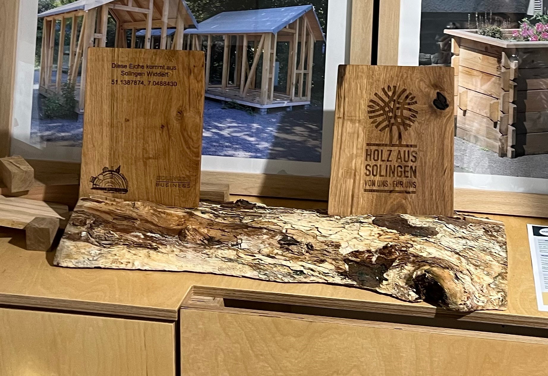 Vor Ort kann man aber auch die Frühstücksbrettchen aus Solinger Holz erwerben. Eine Idee von Solingen.Business in Zusammenarbeit mit dem Unternehmen Fuchstools. Auf den Brettchen ist auf der Rückseite der Herkunftsort des Baumes (Stadtteil und Koordinaten) gelasert.
