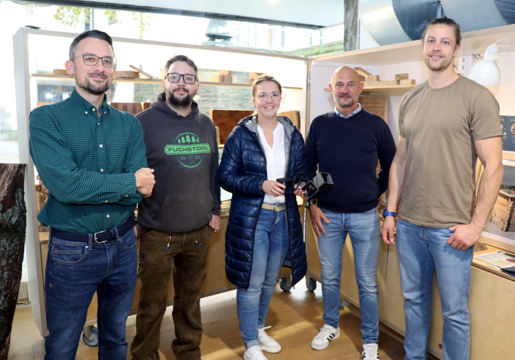 Einen Kubus zum Thema „Solinger Holz“ findet man in der Gläserne Werkstatt auf der Hauptstraße in der Klingenstadt Solingen. Solingen.Business hat einen Gemeinschaftsstand dazu initiiert: mit dabei sind die jungen Unternehmer Marius Anger von Varuta und David Baltus von Fuchstool aus Solingen.
